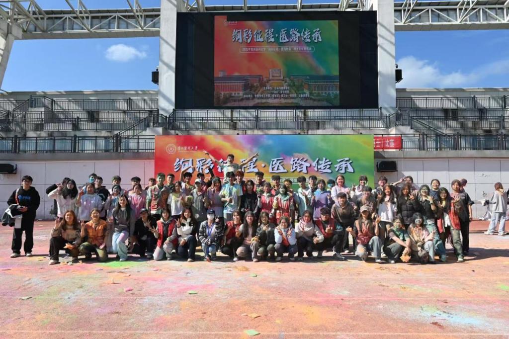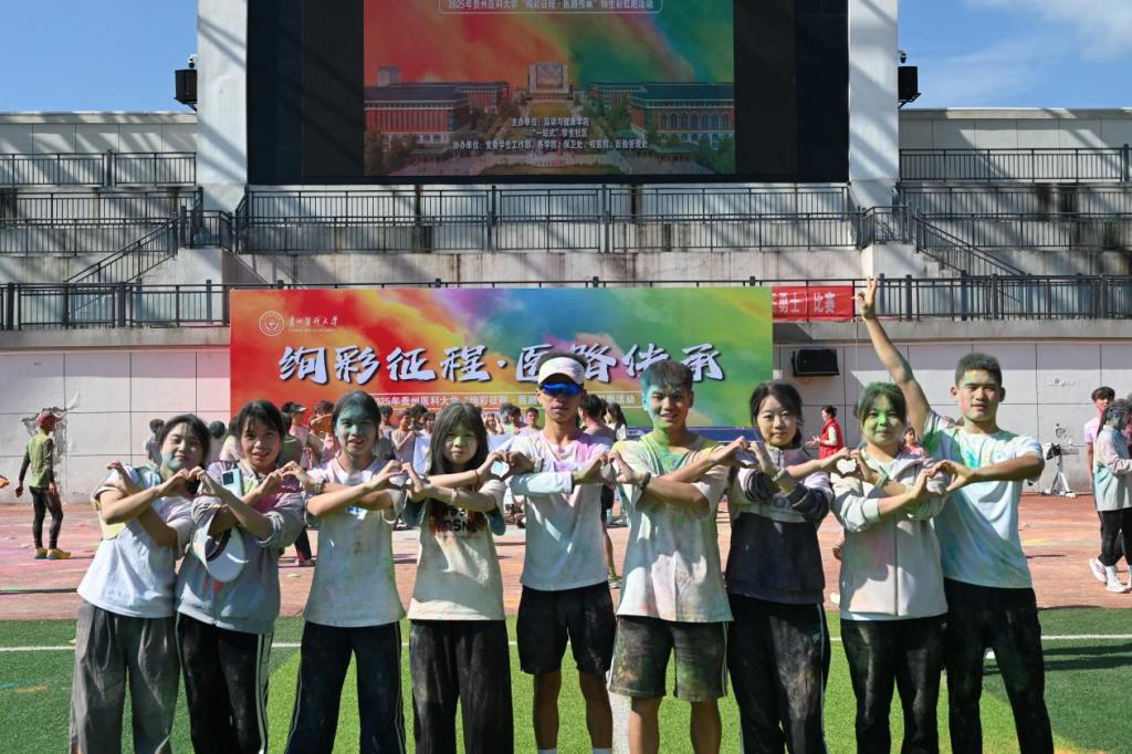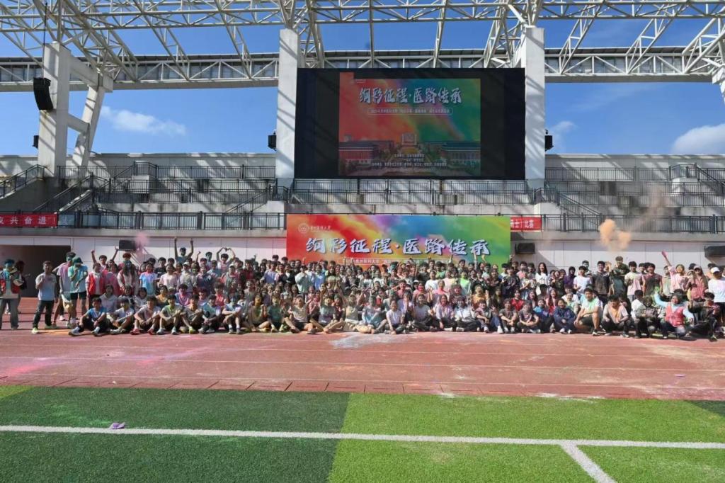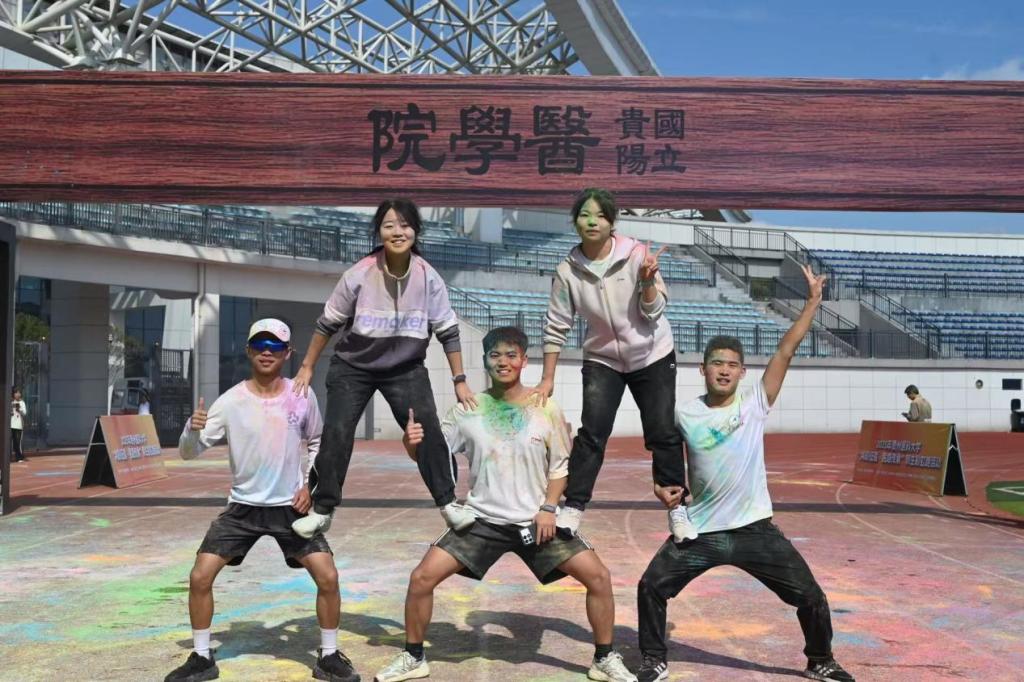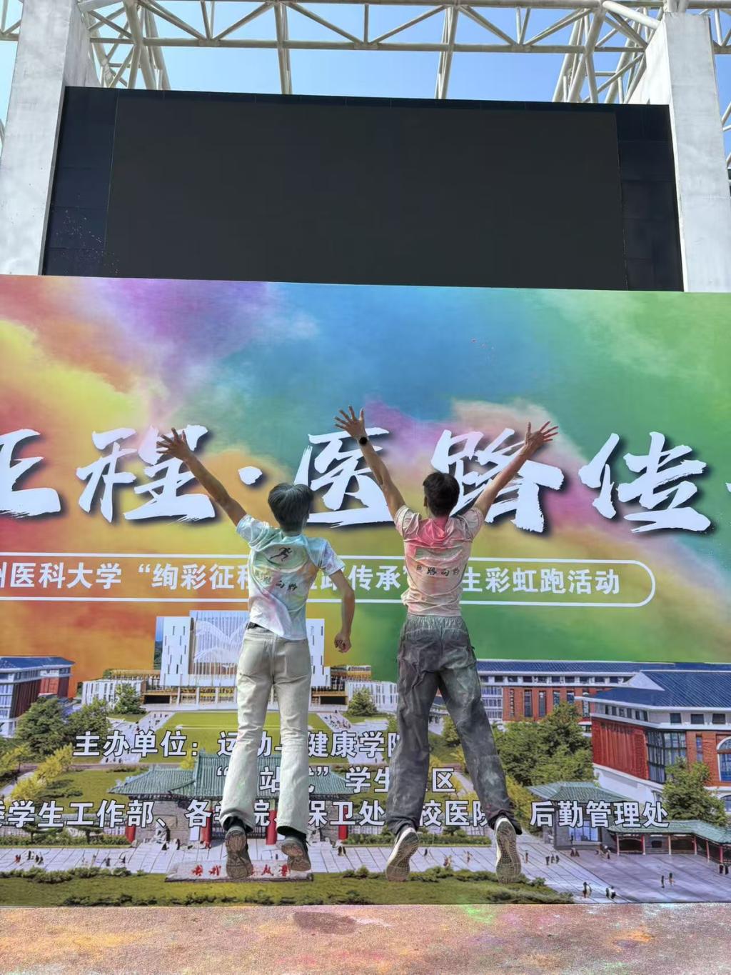 活动在《贵医校歌》的集体合唱中圆满落下帷幕。旋律响起时,漫天彩粉仍在风中轻舞,师生们的脸上洋溢着自豪与感动。这场别开生面的彩虹跑,以寓教于乐的方式,将校史教育、体育精神和美育实践深度融合,不仅有效释放了师生压力,增强了体质,更在轻松愉快的氛围中深化了师生对学校的认同感、归属感和自豪感,激发了大家知校、爱校、荣校的热情,为传承贵医87载荣光、凝聚奋进力量写下了青春注脚。
