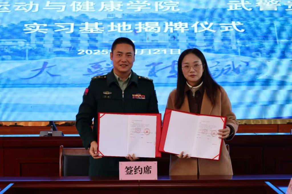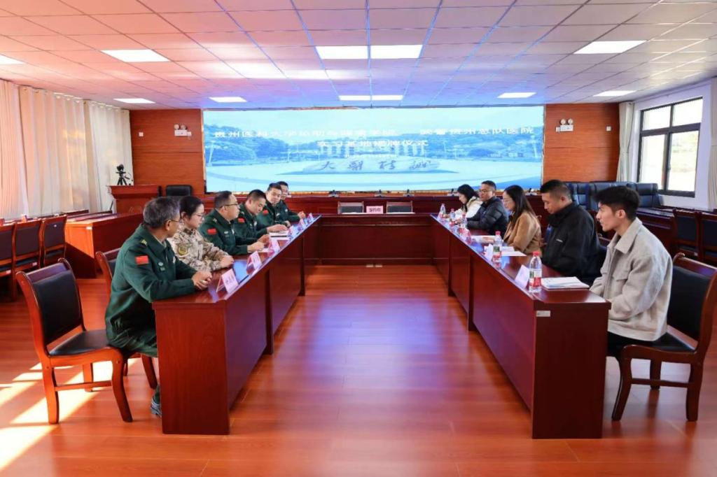 院长周利与武警贵州总队医院院长徐凯签订了实习基地协议书,并举行了实习基地挂牌仪式。仪式后,双方就医校结合育人、医校间科学研究合作等问题进行了深入交流。
