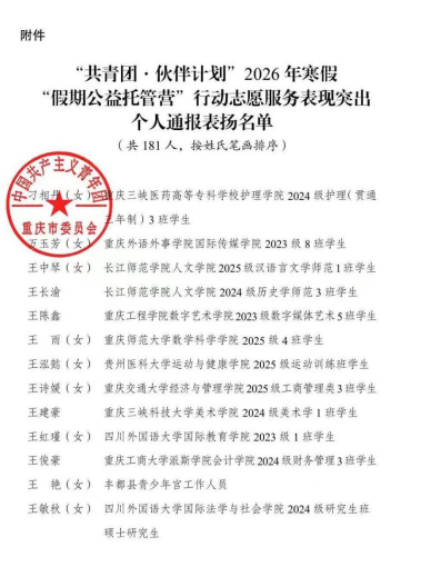 我校bet365娱乐城 2025级运动训练专业王泓懿同学在寒假期间积极参加重庆市“共青团·伙伴计划”2026年寒假“假期公益托管营”行动志愿服务,成绩突出,获重庆市团委通报表扬。